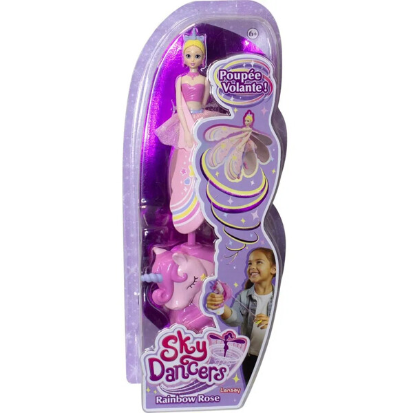Gör dig redo för en virvelvind av magi! Möt Regnbågs-Rose, din strålande Sky Dancer, och hennes skimrande enhörning! Placera henne på enhörningsstartaren, dra i snöret… och se henne snurra och flyga genom luften i en bländande virvel! Inga batterier behövs – bara din magiska touch. En gnistrande leksak fylld av rörelse, färg och förtrollning. Regnbågs-Rose är redo att sväva – låter du henne flyga?