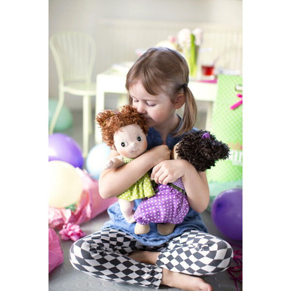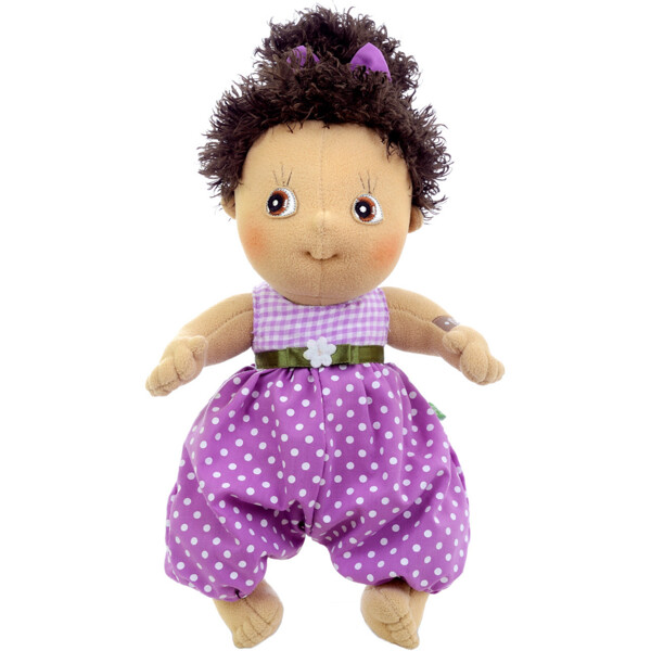 Hanna är en mjuk, supersöt docka från Rubens Barn som snabbt blir ditt barns bästa kompis! Dockan är 32 cm hög och har en mjuk kropp, brun hy, mörkbrunt hår och avtagbara kläder. Hanna älskar att gå på upptäcksfärd, läsa sagor ihop och busa till det ordentligt. Barnet kan öva på att klä på och klä av dockan så att hon är redo för alla möjliga äventyr. Perfekt som barnets första docka!