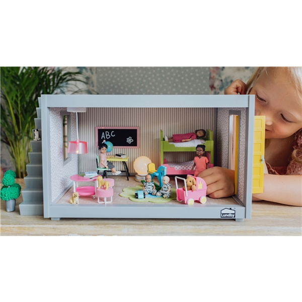 Vinnare av Årets Leksak för Förskolebarn 2019! Skapa ditt eget drömhus med Lundby Room! Är det en lägenhet i ett höghus, en liten stuga eller en undervåning till ditt Lundby Life eller Lundby Creative dockskåp? Skapa rum för lek genom att bygga ihop flera moduler på bredden eller höjden. Bara fantasin sätter gränserna! Dockskåpsmodulerna finns i tre olika storlekar och har vändbara väggar med vackra tapeter från Sandberg Wallpaper. Du kan också ta bort väggarna helt, för att kunna leka i huset från flera håll. Komplettera gärna med trappan och de batteridrivna LED-lamporna från Lundby, som ger din alldeles egna dockskåpskombination en mysig hemtrevnad!