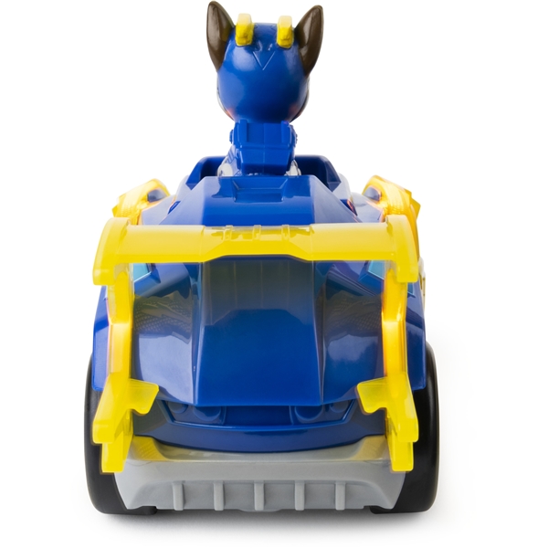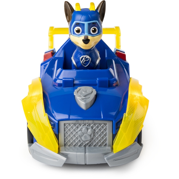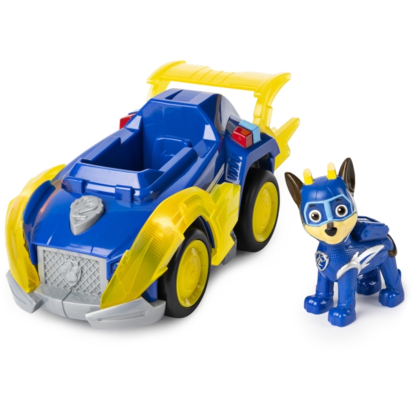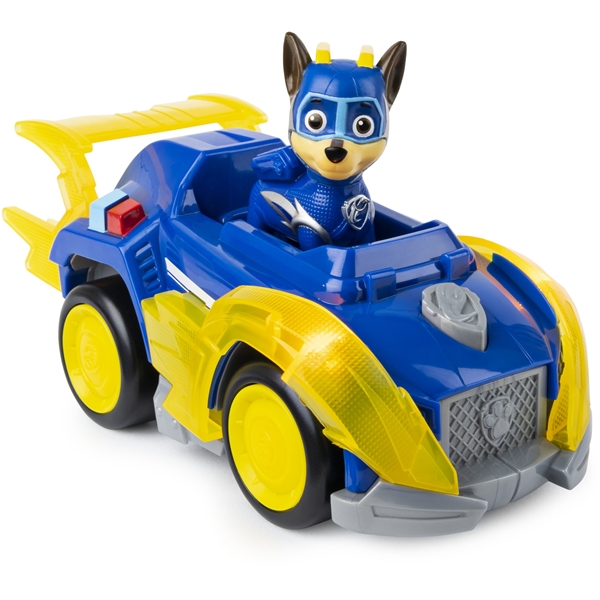 Paw Patrol Mighty Pups Chase är en polis och trafik hund. Chase fokuserar på att hålla ordning och varna trafiken när olyckor inträffar, han hjälper också till och letar när ett djur är försvunnet. Chase bil är blå och gul, det syns när han kommer körandes fram till olycksplatsen.