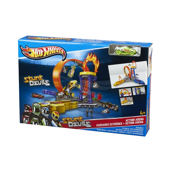 Detta stuntset utgör din alldeles egna Team Hot Wheels-arena där du kan göra superhäftiga trick. Arenan har en hög ramp, justerbara ramper så att bilarna kan snurra i luften, samt avfyrare som kan riktas mot olika stuntzoner. Den kan användas till en bil eller till två som tävlar mot varandra. Leksetet fungerar endast med stuntbilar. 1 stuntbil medföljer.