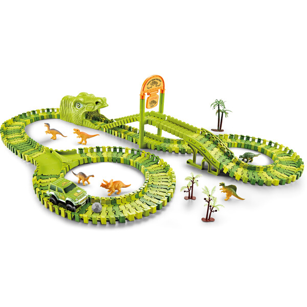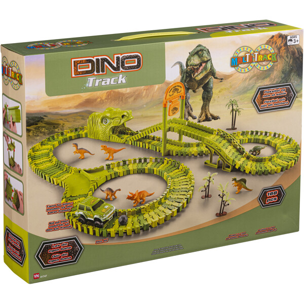Multitrack Dino 168 Delar är ett roligt set där du bygger din egen bana! Delarna är flexibla och lätta att montera. En bil ingår i setet som behöver 1 x AA-batteri (ingår ej). Tryck på bilen undertill så kör den framåt på banan.