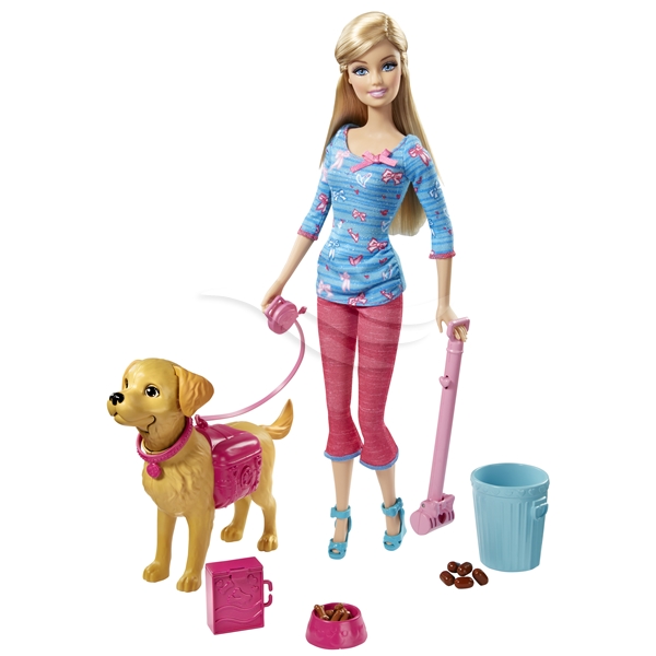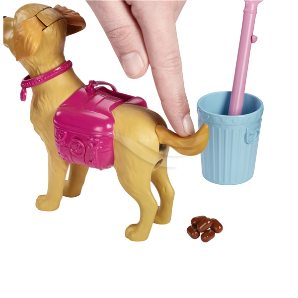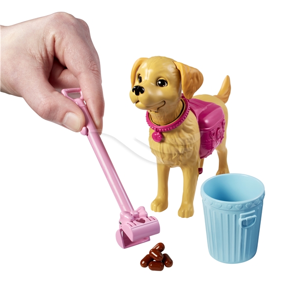 I setet ingår en Barbie- docka, en Taffy- hund, en ryggsäck till Taffy, hundkex i en låda, en matskål, en soptunna, en bajs- skopa och låtsas- bajs. Från 3 år.
