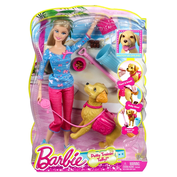 Barbie Potty Trainin' Puppy är ett fint set med Barbie och hennes söta hund Taffy! Barbie ska gå ut på promenad med Taffy! Taffy har på sig en liten ryggsäck full med goda hundkex som hon kan få när hon varit duktig. När Taffy behöver bajsa har Barbie med sig en skopa att plocka upp det med och kan slänga det direkt i den medföljande soptunnan! Hjälp Barbie att ta hand om Taffy! Mata Taffy, gå ut med henne och plocka upp efter henne!