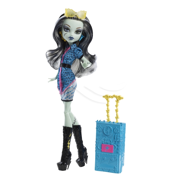 Monster High Scaris Doll Frankie Stein är den elektrifierande snygga Frankie som har med sig resväskan och är redo för äventyr i den läskigt spännande staden Scaris!Monster High-tjejena ska bege sig ut på sin första utlandssemester tillsammans! Deras resemål är Scaris, ljusets stad och Rochelle Goyles hemstad, och de planerar att se allt!