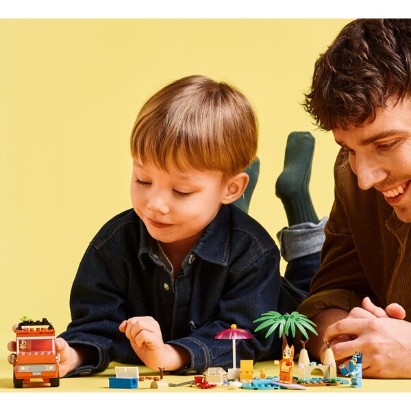 Det här LEGO-setet innehåller seriens ikoniska fordon, med 2 surfbrädor fästa på taket och ett bagageutrymme baktill med plats för kylväskan. Bilens öppningsbara tak gör det enkelt för barn att komma åt insidan, där det finns plats för minifigurerna Bluey, Bingo och Chilli (Blueys mamma).