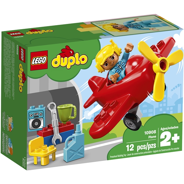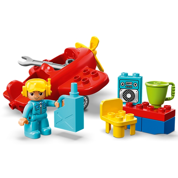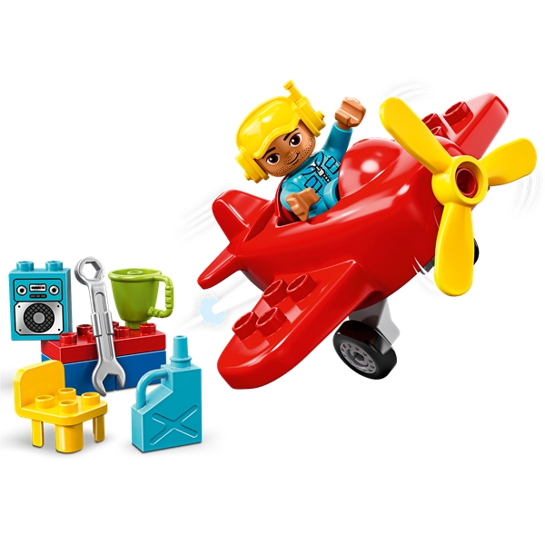 Iscensätt verkliga händelser med LEGO® DUPLO® Town: en värld med moderna DUPLO figurer som är lätt att känna igen sig i. Visa ditt barn hur man hjälper piloten att reparera planet i verkstaden med leksaksskiftnyckeln och oljekannan. Små barn kommer att älska att få det söta röda leksaksplanet att lyfta och flyga genom luften, och att snurra propellern! Denna pedagogiska leksak innehåller en DUPLO pilotfigur.