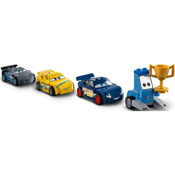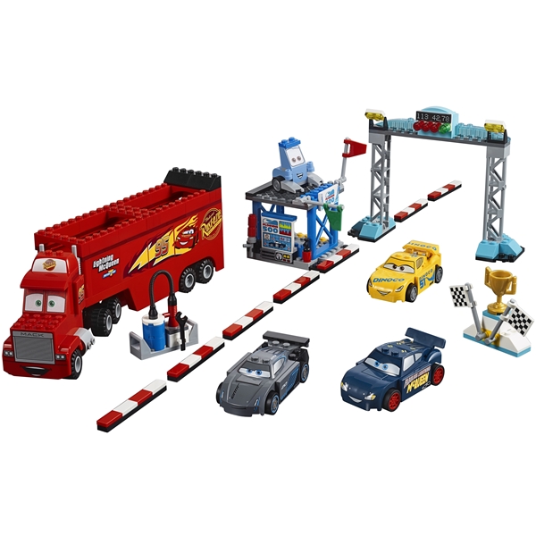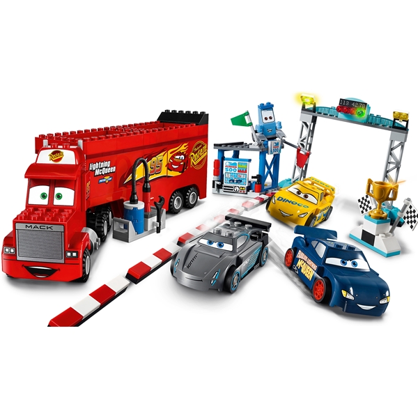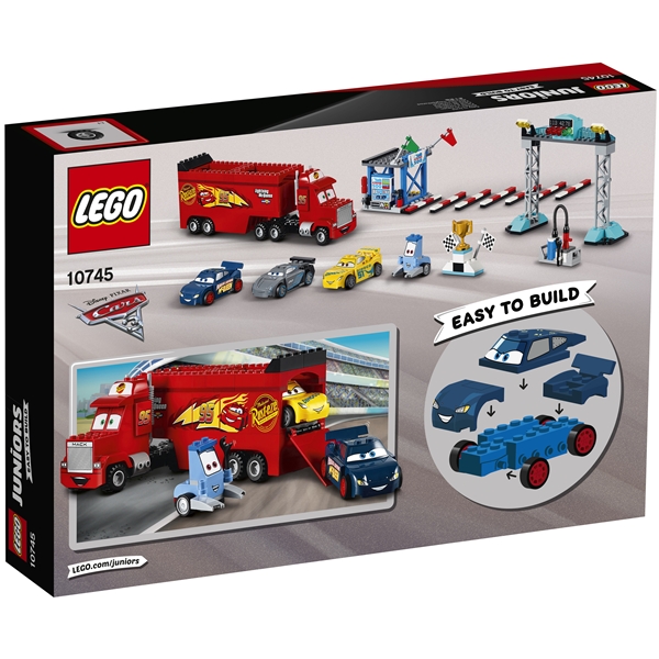Starta motorerna och delta i den spännande Florida 500 Sista tävlingen från Disney Pixar Cars 3, med lättbyggd förmansställning med höjbar röd och grön racerflagga och start-/målvalv, banavspärrningar och prispall med rutiga flaggor och en pokal.Innehåller en enkel guide till byggande och lek och större delar för att stärka självförtroendet hos yngre barn. Innehåller också 5 LEGO Juniors figurer.