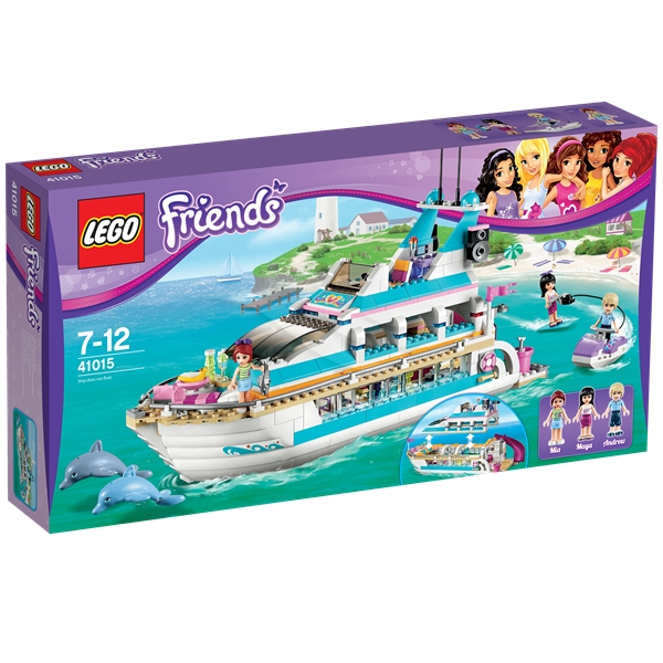 Ge dig ut på ett äventyr till havs ombord på kryssningsfartyget med Mia, Maya och Andrew. Styr båten med Andrew och ta med tjejerna på en tur runt ön med fyren! Åk nerför vattenrutschkanan eller åk vattenskidor efter vattenskotern när du hittar en perfekt badplats! Sola i vilstolarna eller leta delfiner med ekolodet! Sedan är det dags att duka picknickbordet eller blanda till läskande fruktjuicer vid snackbaren! Öppna kryssningsfartyget för att leka inuti när solen går ner. Gör i ordning Mia och Maya i duschen och badrummet inför festen på kaptensdäcket. Umgås i vardagsrummet på nedre däck och bädda ner LEGO® Friends i mysiga sängar. 41015 LEGO Friends Kryssningsfartyg innehåller minidockorna Mia, Maya och Andrew.• Innehåller minidockorna Mia, Maya och Andrew • Med vattenrutschkana, kaptensdäck, kök, vardagsrum, sovrum med två sängar, badrum, dusch, fördäck med snackbar och vilstolar samt vattenskoter • Tillbehör: vattenskidor, delfinekolod, soffa, växt, mat, glas och delfinmat • Upplev en häftig åktur på vattenskotern och vattenskidorna! • Öppna yachten för att leka inuti! • Åk nerför vattenrutschkanan för att bada! • Leta delfiner med ekolodet! • LEGO® Friends delar är kompatibla med alla klossar i LEGO systemet • Samla alla LEGO Friends set och upptäck en värld av bygglädje med LEGO Friends! • LEGO minidockor är LEGO figurer som är särskilt utformade för LEGO Friends och kan anpassas och kombineras på tusentals sätt • Modellen är 17 cm hög, 38 cm lång och 19 cm bred