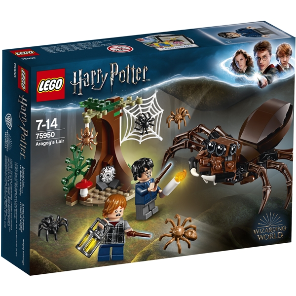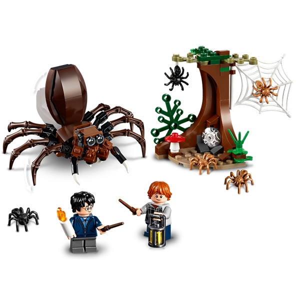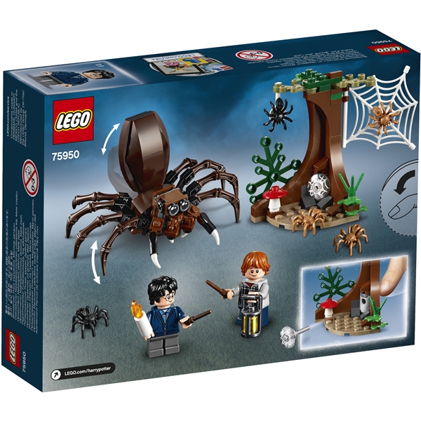 75950 LEGO Harry Potter Aragogs Håla - Vem vågar sig in i LEGO® Harry Potter™ 75950 Aragogs håla? Hjälp Harry och Ron att fly från jättespindeln och hans armé av avkommor i den förbjudna skogen. Använd trollstavarna och lyktan för att försvara dig mot spindelhorden, flygande spindelnät och Aragogs skräckinjagande huggtänder – och fly sedan från den läskiga hålan!• Innehåller minifigurerna Harry Potter™ och Ron Weasley™.• Med den byggbara spindeln Aragog och ett byggbart träd.• Aragog har 8 rörliga ben och 2 rörliga huggtänder.• Trädet har en nätskjutningsfunktion, tillhörande spindelnät och en byggbar rödvit svamp.• Avfyra trädets spindelnät för att fånga Ron och Harry!• Tillbehör: 2 trollstavar, lykta, ljus, spindelnät och 5 spindlar.• Trädet är 8 cm högt, 7 cm brett och 5 cm djupt.• Aragog är 4 cm hög, 11 cm lång och 11 cm bred.
