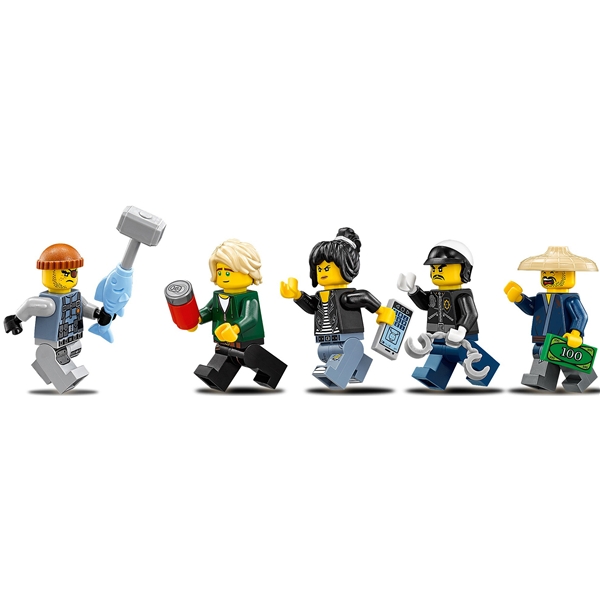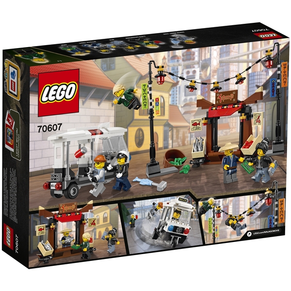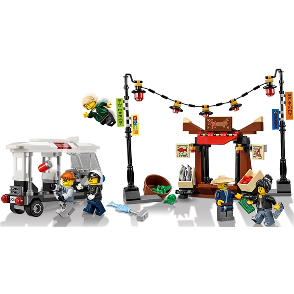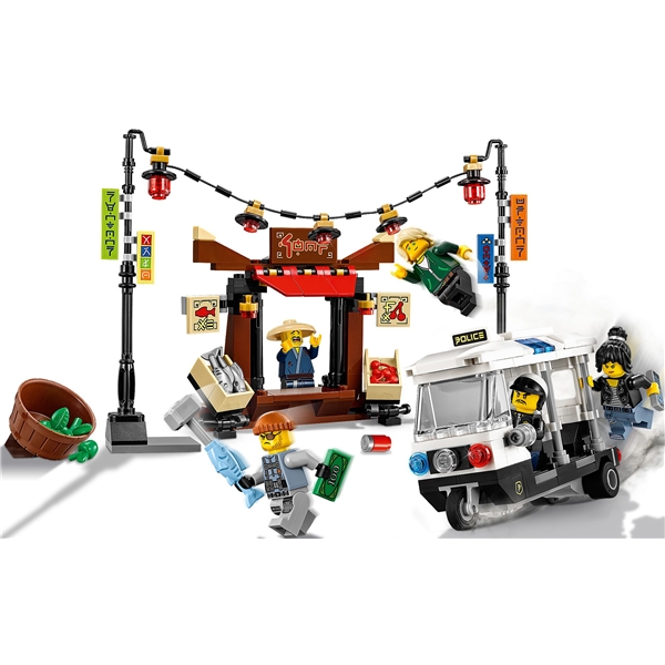 Samarbeta med Lloyd Garmadon, Nya och polisen Toque för att hindra hajskurken från att råna matförsäljaren i setet NINJAGO® City jakt.Det här spännande THE LEGO® NINJAGO MOVIE™ setet innehåller polisens tuk-tuk med 3 hjul, matstånd med olika matdelar plus 2 lyktstolpar med en girland med festliga NINJAGO lyktor. Setet innehåller även 5 minifigurer: Lloyd Garmadon och Nya (båda med skoluniformer som är nya för augusti 2017), polisen Toque, hajskurk och Ham.