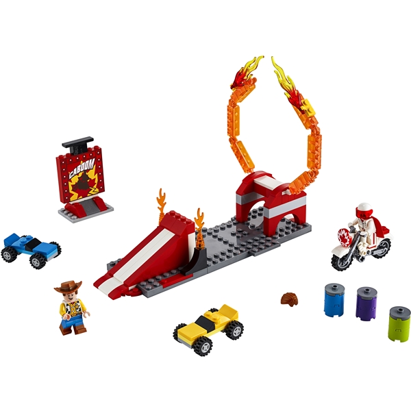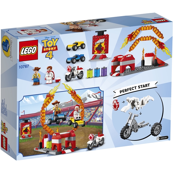 Låt ditt barn uppleva spänningen och äventyren från Disney Pixars Toy Story 4 med LEGO® setet 10767 Duke Cabooms stuntshow. Det här roliga byggsetet är särskilt utformat för att vara enkelt och underhållande för barn i förskoleåldern och innehåller en justerbar eldring med ramp och 2 unika startklossplattor som låter nybörjare uppleva stoltheten i att på egen hand bygga fordon, byggnader och annat. Det här roliga setet innehåller dessutom en byggbar motorcykel, 3 stapelbara burkar, 2 bilar och en vältbar stuntskylt. Den enkla bygg- och lekguiden som ingår hjälper din unga stuntförare att förstå syftet med bygginstruktionerna och stimulerar fantasin och självförtroendet för en fantastisk start på LEGO byggandet i en rolig Toy Story miljö. Innehåller 2 minifigurer för rolig rollek.