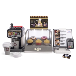 3-2-6 Kaffe Shop är en rolig leksak med touchskärm och kortläsare med ljud, tårtdisplay med ljus, espressomaskin med tillbehör, muffins och donuts, kreditkort och 2 drickskoppar med lock.
