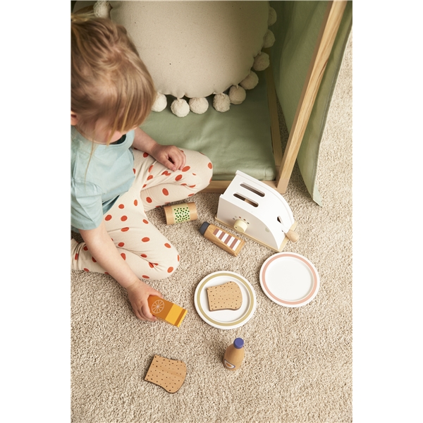 Ett set med fem olika flaskor och en burk i FSC-certifierat trä. Ett bra komplement till barn som älskar att laga mat eller gå till affären. Du hittar apelsinjuice, ärtburk, stark sås, vad-du-än-gillar-sås och ketchup.