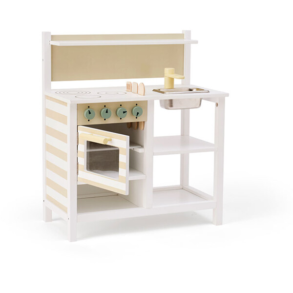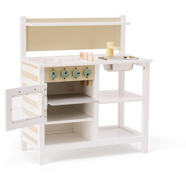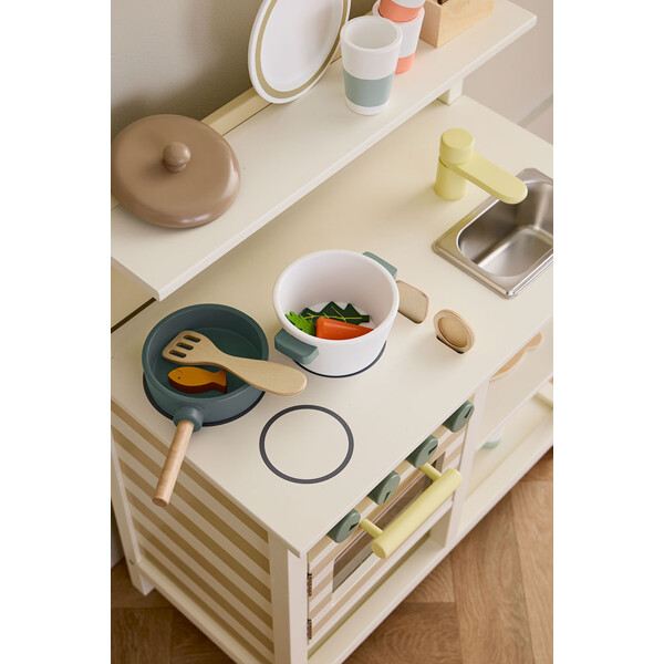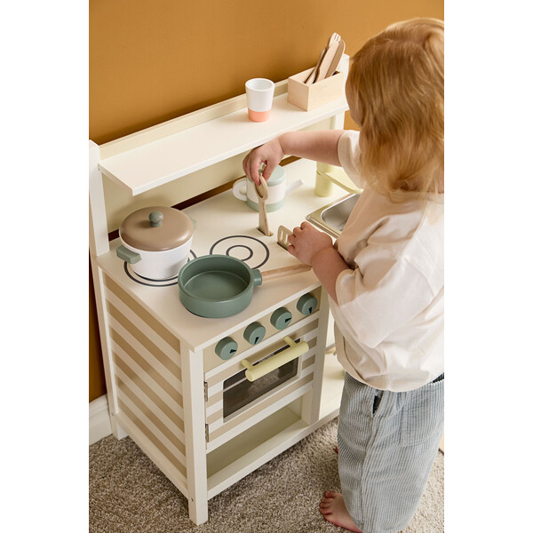 Köket har en ugn med en dörr som går att öppna, en bakplåt som går att ta ut och ett set med grytor och pannor, inklusive ett lock som passar både stekpannan och grytan. Tre träredskap – en sked, en hålslev och en spatel – ingår och kan förvaras på ett prydligt sätt i sin integrerade förvaring direkt i bänkskivan. En liten hylla på bakväggen erbjuder plats för små föremål, medan en öppen hylla under ger extra förvaring för grytor, pannor eller leksaksmat. Det randiga mönstret på ugnens framsida och kökets sida ger en enkel, lekfull detalj.