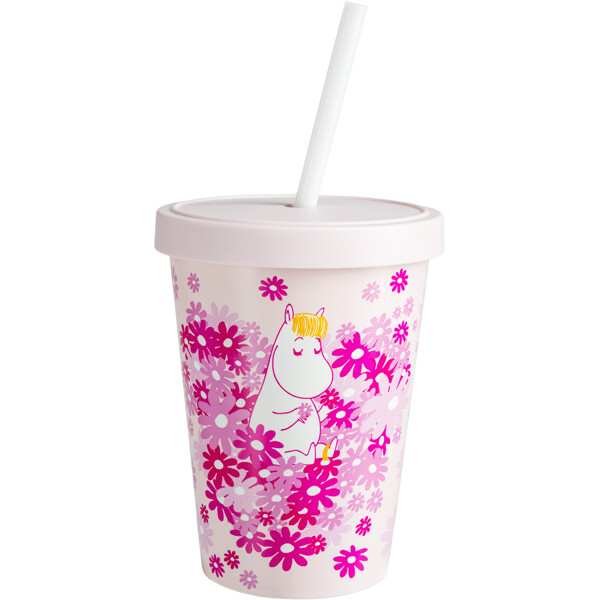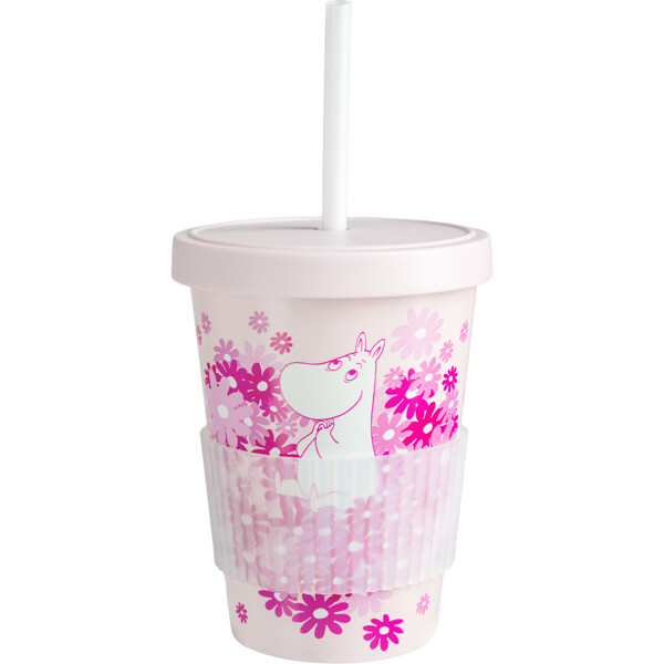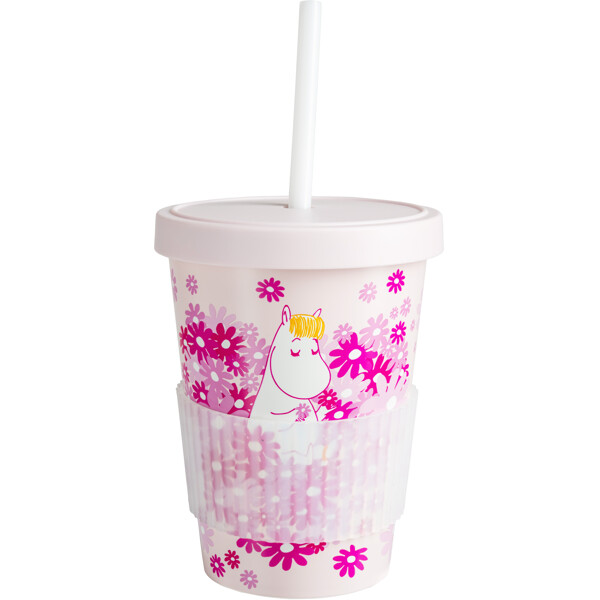 En söt, rosa sugrörsmugg med lock, tillverkad i återvunnen plast, med kärleksfullt muminmotiv.