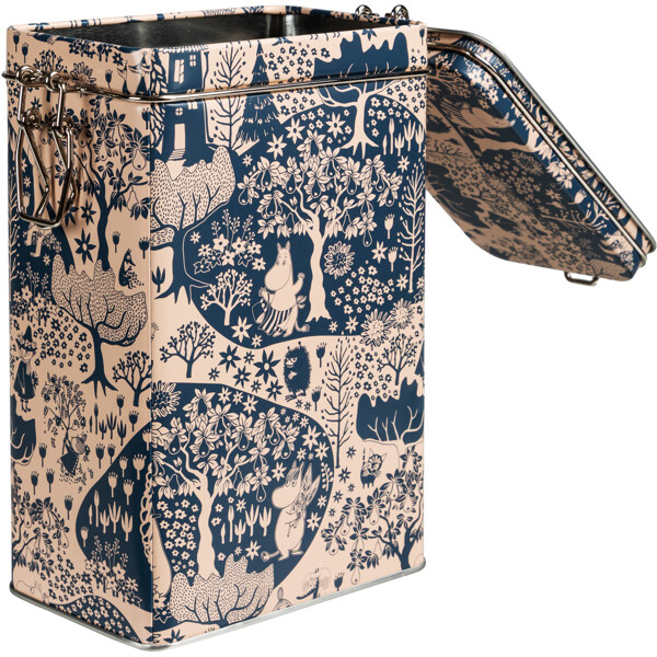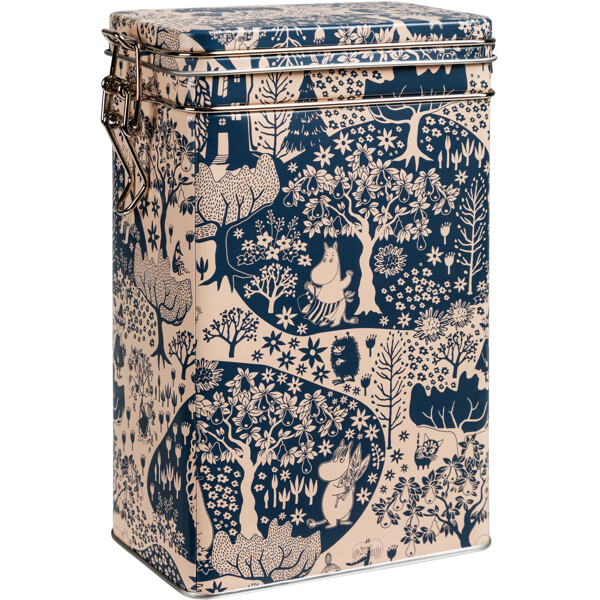En Premium-kaffeburk med ett klassiskt och vackert muminmotiv i mörkblått.