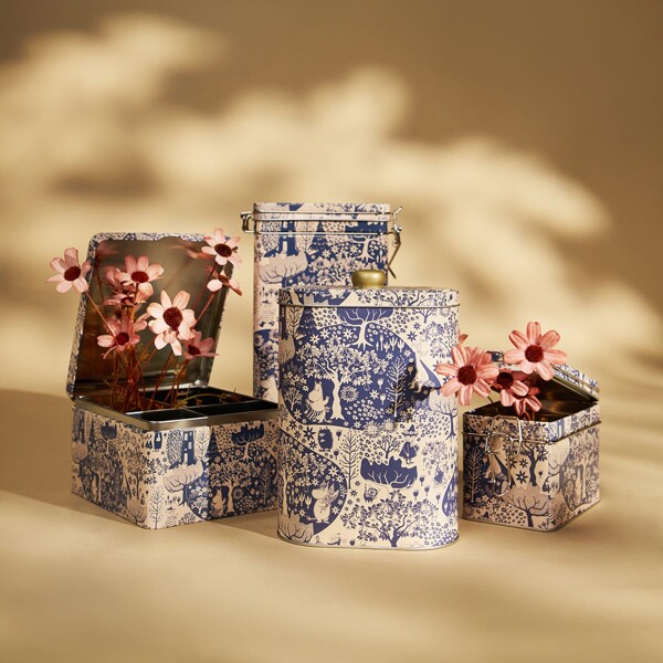 En Premium-teburk med ett klassiskt och vackert muminmotiv i mörkblått.