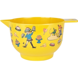 Denna bakskålen är i en härligt knallgul färg med fina bilder av Pippi som bakar på skålens utsida. Bakskålen har en gummiring i botten som ger ett bra fäste, har en praktisk hällpip och i handtaget finns det ett hål för upphängning på krok.