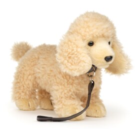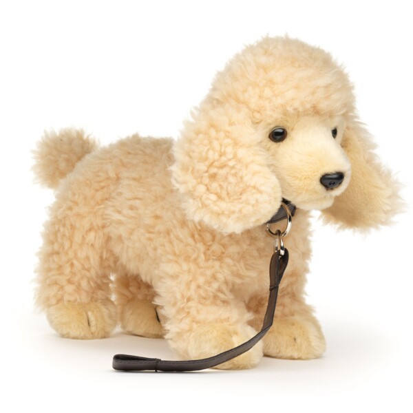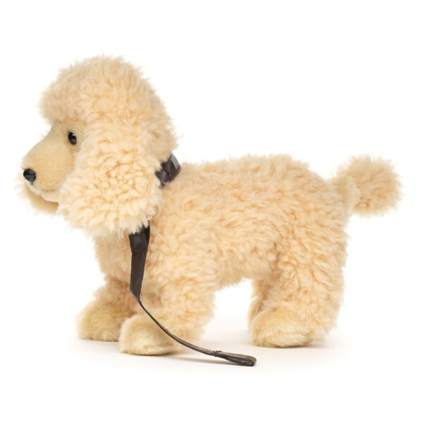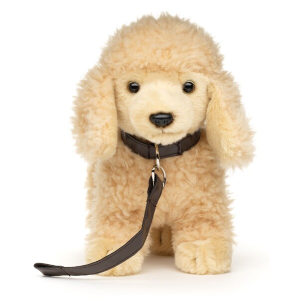 Denna fina pudel med koppel från Uni-toys har ett verklighetstroget utseende och blir snabbt barnets bästa vän!Den mjuka goa kroppen är stoppad med 100% återvunnet material.24x15x22cm