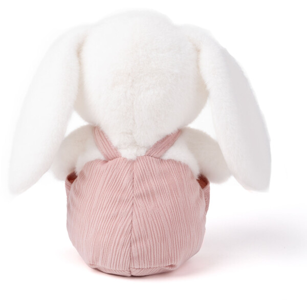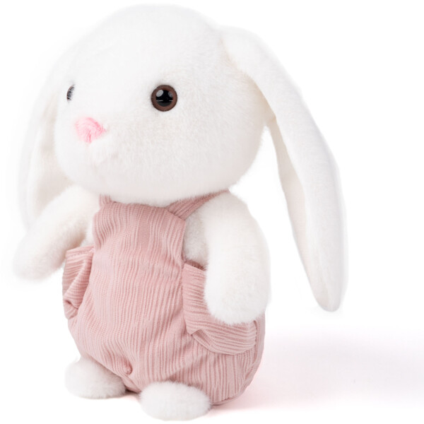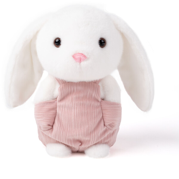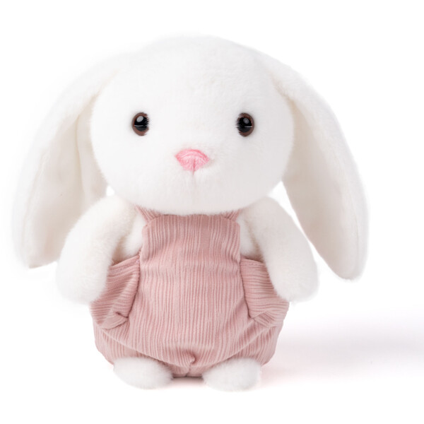 En mjuk vit kanin klädd i rosa hängselbyxor med små fickor.