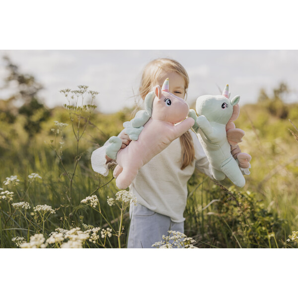 En lekfull enhörning i pastellfärger med broderade ögon och regnbågsfärgat horn.
