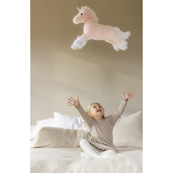 Liggande enhörning i ljusrosa & vitt att finnas i en behändig storlek. Hovarna och hornet glittrar i en skimrande, förtrollande vit ton. Den perfekta gåvan för alla tillfällen.