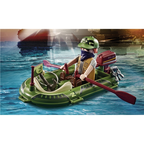Den modiga PLAYMOBIL-polisen håller också ordning i luften. En bov är på flykt med smuggelvaror. Tjuven försöker fly i gummibåten. Men den smarta piloten håller ett öga på honom från sin cockpit och låter honom inte komma undan. Hon landar skickligt planet på sjön och boven är fast. Polisen sätter på handbojor och leder boven till planet och till polisstationen.Leksetet innehåller två PLAYMOBIL-figurer, ett sjöflygplan,en båt, pilothjälm, basker, handbojor och många fler extra tillbehör för spännande polisäventyr. Planet kan flyta och propellern kan rotera.