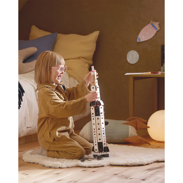 Raketen har 3 steg: steg 1 med huvudmotorerna, steg 2 och steg 3 med en blinkande nos. Raketen kan byggas om till både en rymdfärja och ett flygplan, eller så kan delarna användas för annan kreativ lek.