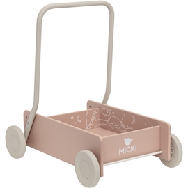 Mickis klassiska Lära-gå-vagn i trä! Vagnen ger ett stabilt och säkert stöd vid barnets första steg och har bromsbara hjul samt ställbart handtag. När barnet lärt sig gå kan handtaget ställas om och vips blir det en rolig lekvagn i flera år. Kanske behöver klossarna köras någonstans eller så vill nallen åka med en sväng? Låt leken visa vägen på resan!