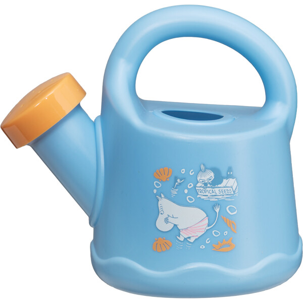 En liten, blå vattenkanna med somrigt muminmotiv. Kannan rymmer 8 dl vatten och handtaget sitter stadigt i en liten hand. En trevlig leksak i badet, på stranden eller för den lilla hjälpredan i trädgården.