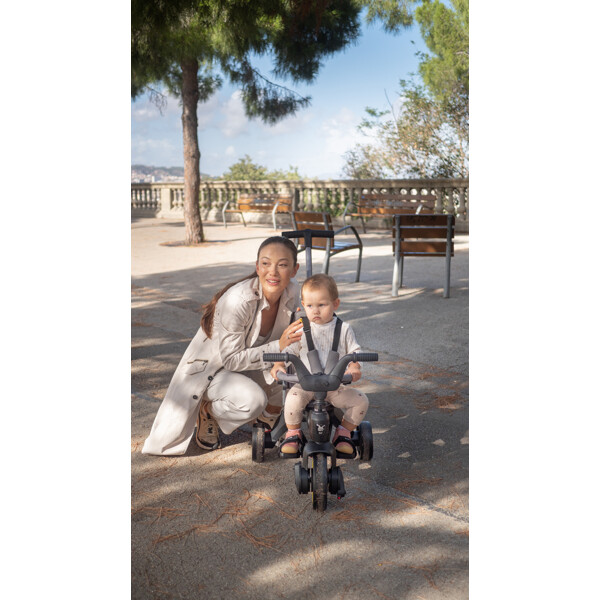 För en trygg åktur för de yngsta använder föräldrarna styrhandtaget, som har en steglös höjdjustering. Liki har också en sufflett mot UV-strålning, säkerhetssele och en fotbroms som kan aktiveras.
