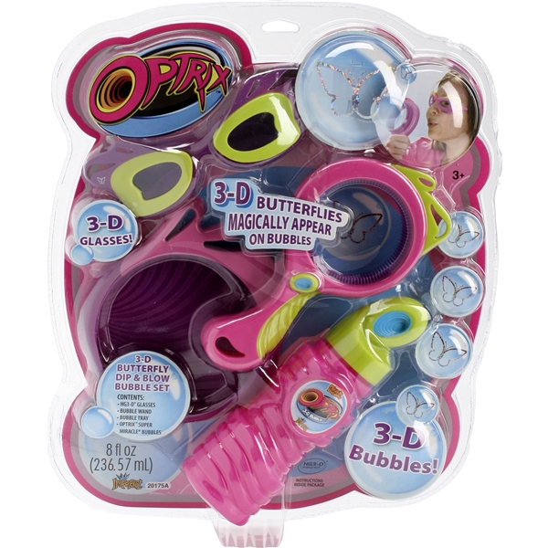 Optrix 3D Bubble Set – Fjäril ger en ny dimension av rolig bubbel- lek! 3D- bilder kommer fram som genom magi i bubblorna när du tar på dig de häftiga Optrix HG3-D- glasögonen!