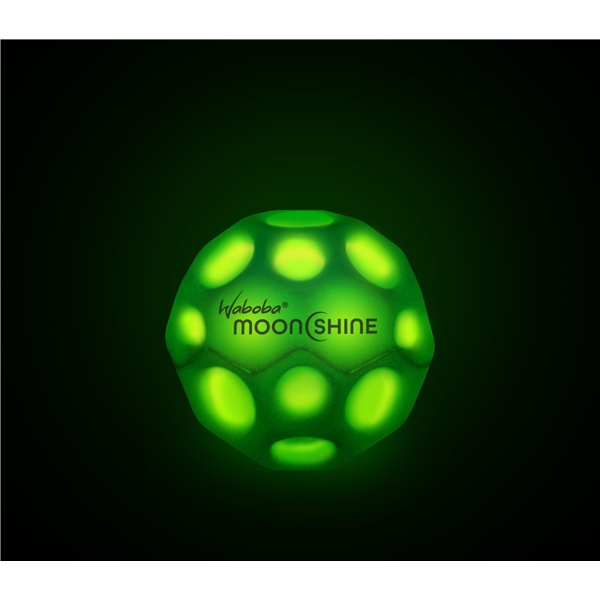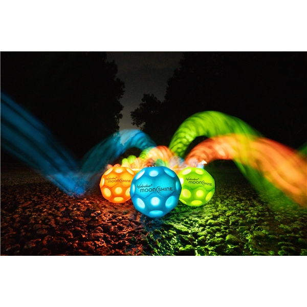 God natt solsken. Hej månsken. Lek i mörkret med den här självlysande månbollen. När bollen studsar aktiveras det vita stroboskopljuset.