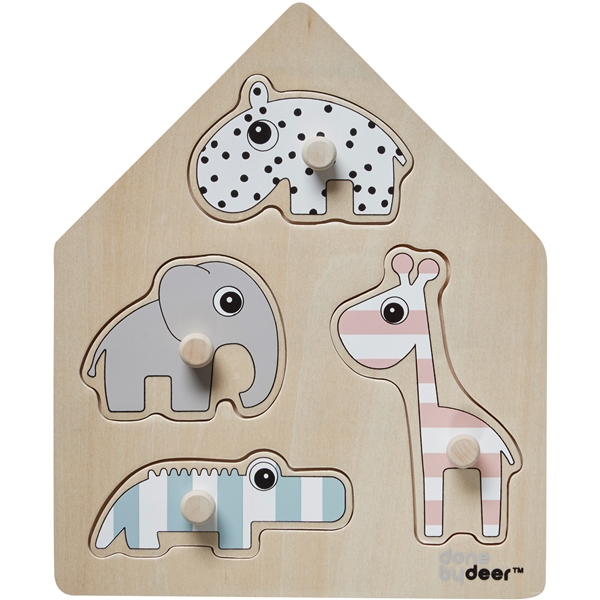 Done By Deer Peg Puzzle Deer Friends är ett träpussel som hjälper barnet att utveckla motoriken. Hitta rätt platser för Elphee, Croco, Ozzo och Raffi i detta gulliga pussel.