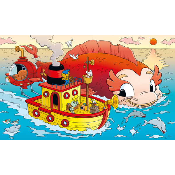 Pussel 100 Bitar Bamse Havets Hemlighet är ett fint pappussel med Bamse och hans vänner. Vännerna är ute på havet med Victoria och möter en väldigt stor fisk.