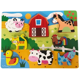 Glada bilder och starka färger gör pusselbyggaren glad och samtidigt utvecklas barnets uppfattningsförmåga och fingerfärdighet. Barnet kan även leka med dessa hållbara pusselbitar. Pusslets tema är bondgårdsdjur.