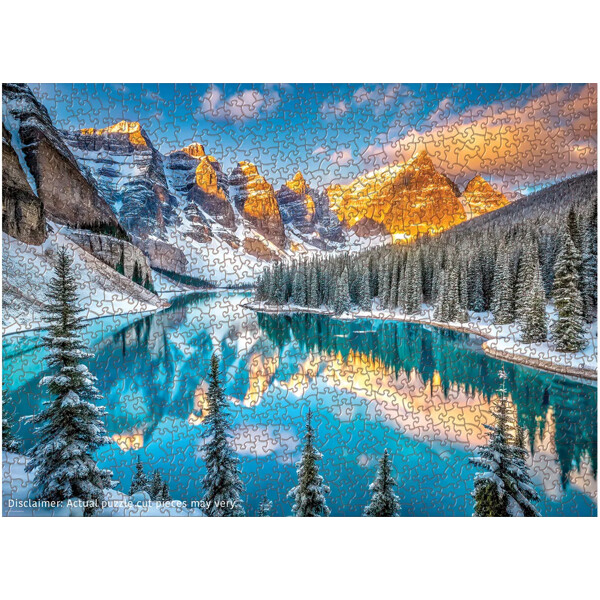 Förlora dig själv i ett hisnande vinterpanorama: glödande alpina toppar, snötäckta vintergröna träd och en glasklar, turkos sjö som speglar soluppgången. Skarpa kontraster – isiga blå nyanser, gyllene ljus, klippväggar, skogsstrukturer och perfekta reflektioner – skapar tydliga sektioner att dela för ett smidigt och tillfredsställande pusslande.