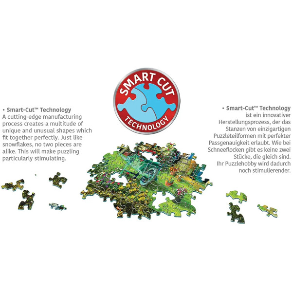 Smart-cut: Denna banbrytande tillverkningsprocess skapar en mängd unika och ovanliga former som passar perfekt ihop. Precis som snöflingor är inga två bitar likadana. Detta gör pusselläggandet särskilt utmanande och stimulerande.
