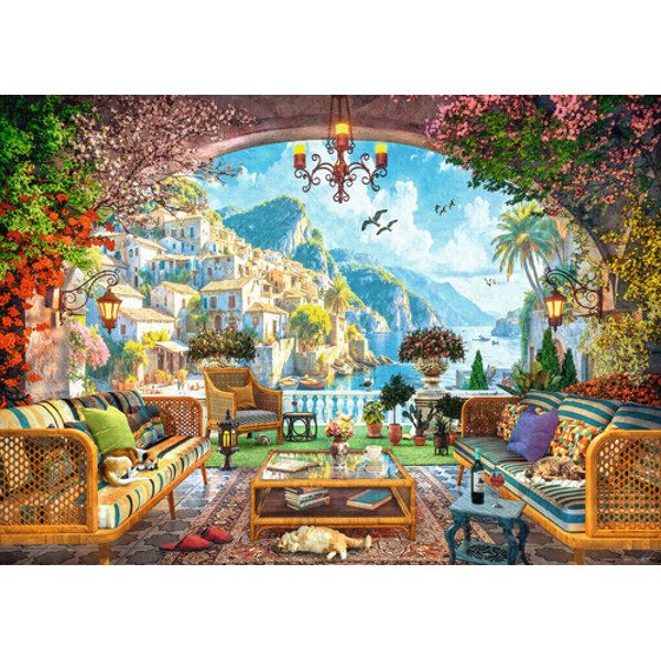 Byggnader som tycks rasa nerför bergssidan, knuffar och skjuter varandra längs vägen mot det klara turkosblå havet nedanför. Små roddbåtar i trä ligger förtöjda i kvällsskenet och väntar på gryningen av ännu ett soligt äventyr. Detta är utsikten från denna underbara medelhavsbalkong, med sina färgglada växter och bekväma möbler som hunden och till och med katten njuter av. Vilken plats att njuta av ett eller två gott glas lokalt vin, medan man tittar på solnedgången, följt av en promenad och kanske något att äta.