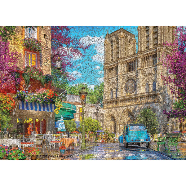 Smutta på den parisiska livsglädjen. Dominic Davison har målat en solbelyst eftermiddag bredvid Notre-Dame-katedralen: cafébord under randiga markiser, blomsterprydda balkonger, en vintage bil och glänsande kullerstenar efter ett lätt regn. Distinkta zoner – stenfasader, blommor, himmel, cafédetaljer och reflektioner – skapar ett tillfredsställande motiv.