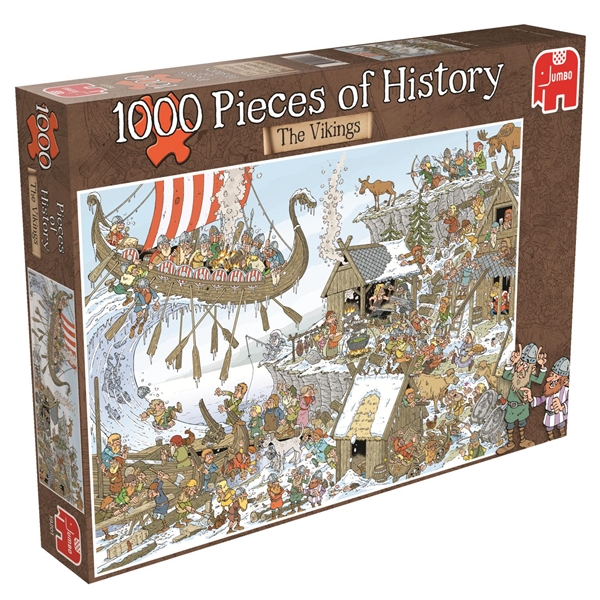 Pussel 1000 Bitar Pieces of History The Vikings är ett 1000 bitars pussel med ett detaljrikt och humoristiskt motiv av Rob Derks tillverkat i hög kvalitet av Jumbo.Om du gillar Jan van Haasterens motiv kommer du troligen också att gilla Rob Derks motiv. Rob har jobbat tillsammans med Jan i hans studio.I Pieces of History The Vikings får vi följa med tillbaka till vikingatiden. Motivet är fartfyll och innehåller till exempel vikingar fastfrusna i en våg, frusna vikingar i en vikingabåt och en fastfrusen fiskare. Jumbo tillverkar sina pussel i Nederländerna och de drivs av sina mål att skapa innovativa och utmärkta kvalitetspussel.