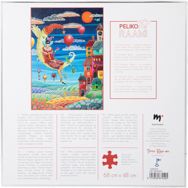Innehåller pusselunderlägget Peliko Raami, som gör det enkelt att bygga och rama in bilden i en standardram på 50 x 70 cm.