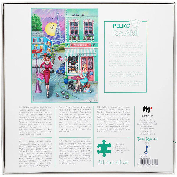 Innehåller Peliko Raami, en pusselmonteringsplatta som gör det enkelt att pussla och rama in pusslet i en ram i standardstorlek 50 x 70 cm.