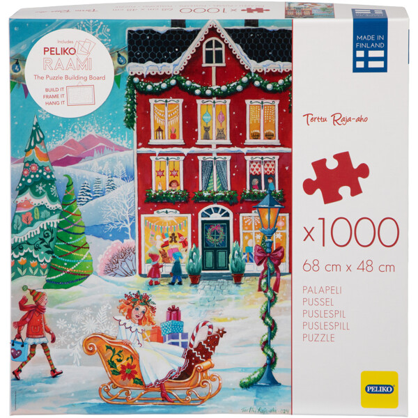 Ett 1000 bitars julpussel med ett underbart och stämningsfullt motiv skapat av den finska konstnären Terttu Raja-aho. Juliga skyltfönster, en dekorerad julgran och lucia i släden med julklappar.