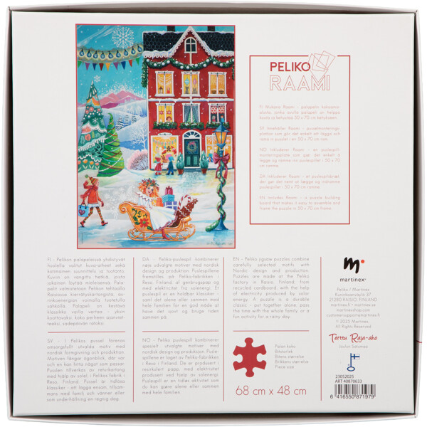 Innehåller Peliko Raami, en pusselmonteringsplatta som gör det lätt att pussla och rama in pusslet i en ram i standardstorlek 50 x 70 cm.