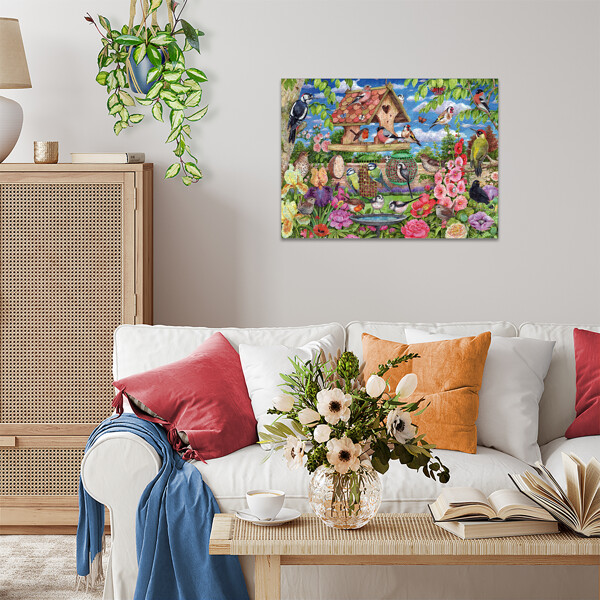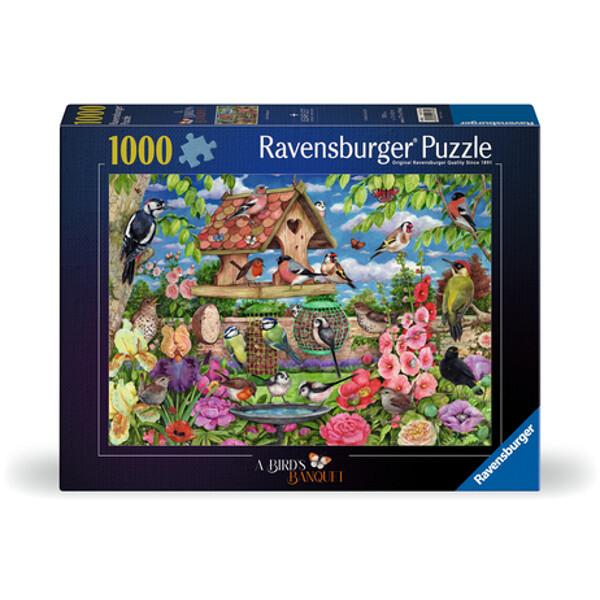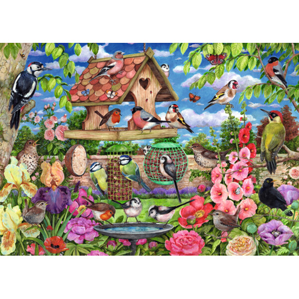 På det stora fågelbordet sitter en rödhake, domherre, bofink, en steglis och en långstjärtad mes. Ett par glada blåmesar njuter av jordnötterna bland blommorna. Det finns till och med ett par hackspettar som tittar och väntar på en möjlighet att komma ner, till synes medvetna om att deras storlek kan skrämma bort de mindre fåglarna. Medan de är i vattenskålen släcker ytterligare två mesar och en rödhake sin törst.