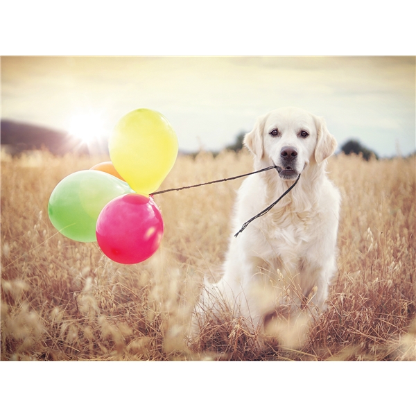 Pussel 500 Bitar Balloon Party är en gullig hund med färgglada ballonger på ett fält.