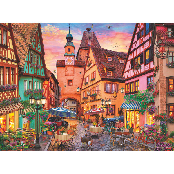 Fördjupa dig i Bayerns charm med detta fängslande 500-bitars pussel, som visar en pittoresk scen direkt ur en saga. När du lägger det här härliga pusslet kommer du att promenera längs en pittoresk tegelgata med färgglada byggnader som lyses upp av mjukt, inbjudande ljus, med bord och stolar utanför charmiga kaféer som inbjuder dig att föreställa dig att du njuter av en lugn måltid utomhus. Vänliga hundar vandrar omkring på gatorna och bidrar till den idylliska atmosfären.
