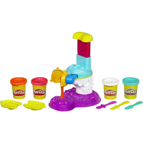 Gör utsökt låtsasglass och klubbor med stämpeln, formar och pinnar. Setet innehåller 1 isglassform, 1 klubbform, 4 glasspinnar och 4 Play-Doh-burkar.
